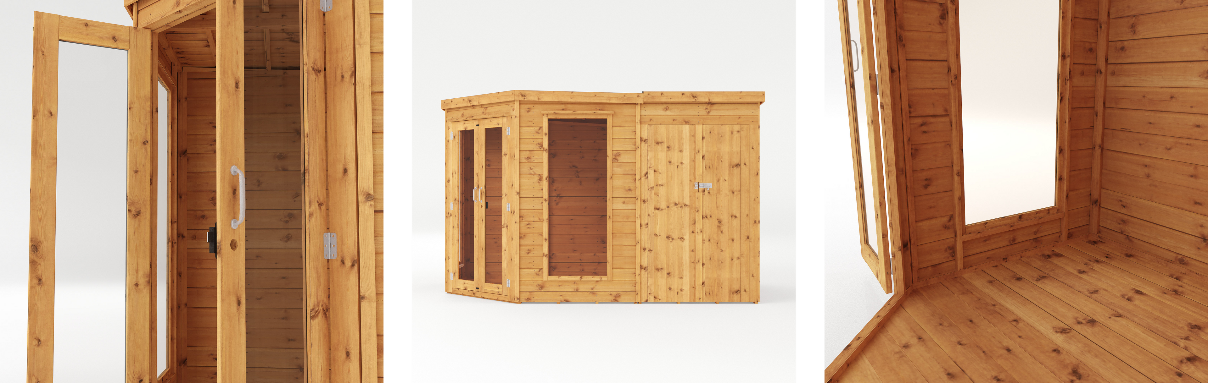 A corner summer house is a smart choice for smaller gardens or those wanting to maximise growing space, neatly fitting into a corner to make the most of the morning or evening light.