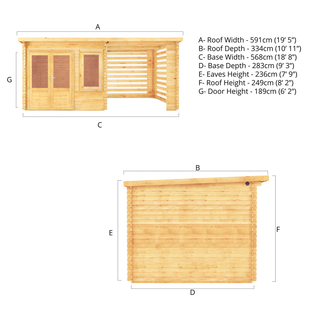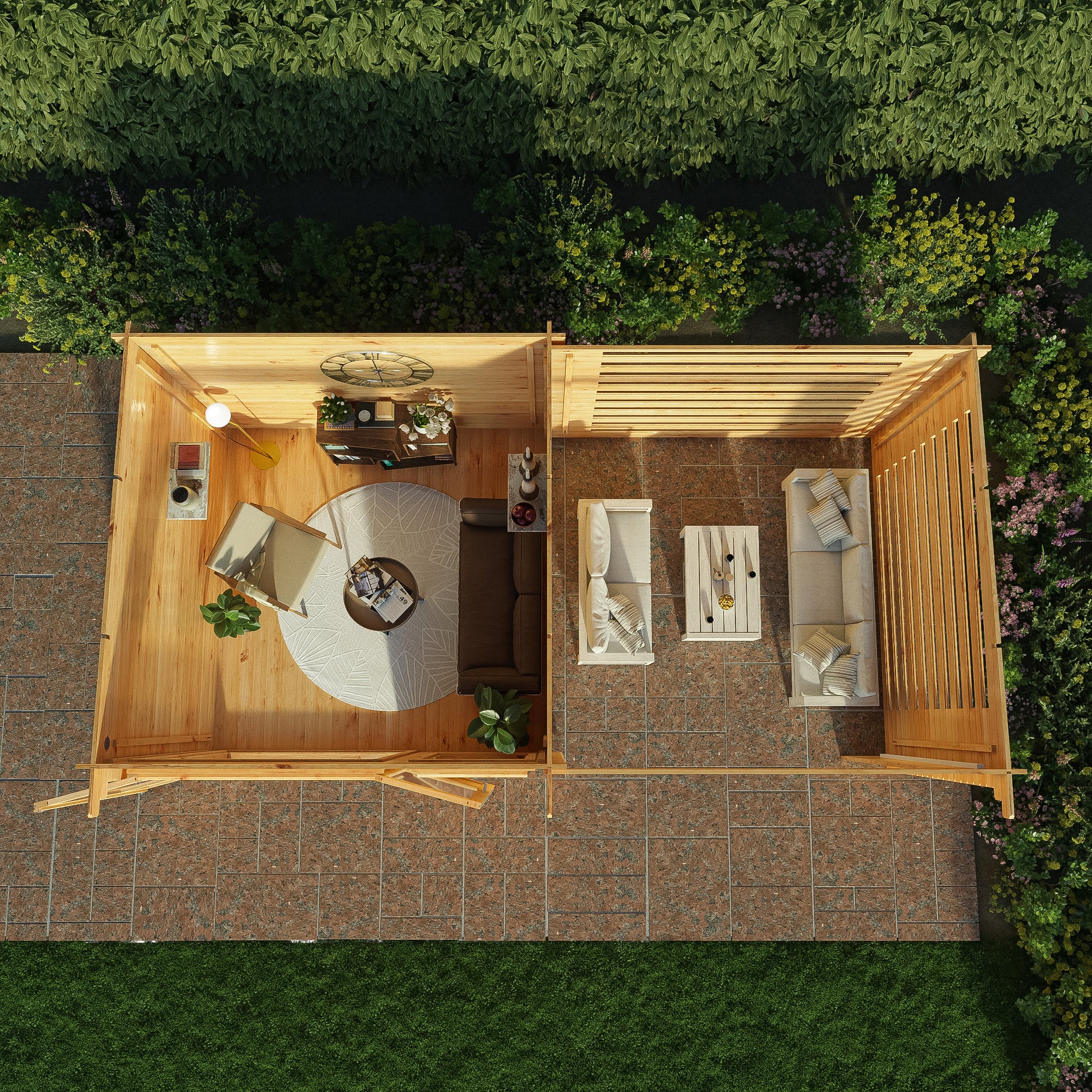 With the added advantage of a slatted area, this versatile extension can be positioned on either side of your cabin, offering additional space for unwinding or entertaining. Whether you're enjoying outdoor dining or immersing yourself in a book amidst the tranquil chirping of birds, this feature elevates your log cabin experience. The log board thickness for the slatted area is 28mm.