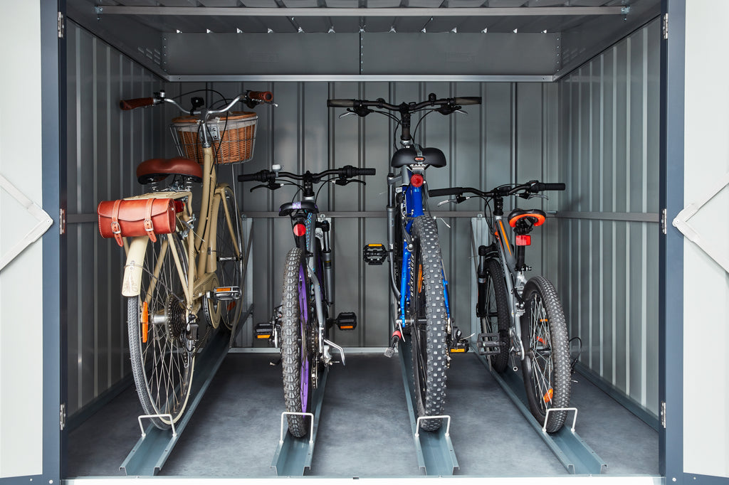 Front-opening double doors provide easy, practical access for bikes, while the integrated locking system ensures they stay safe and protected when not in use.